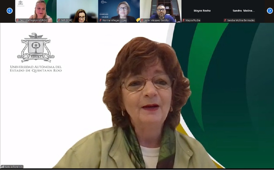 La Rectora Dra. Natalia Fiorentini Cañedo brindó las palabras de bienvenida a la Mtra. Norma Villegas López, Vocal Ejecutiva del Comité de Ciencias Naturales y Exactas de los CIEES, los integrantes de la Comisión de Pares Académicos, Dr. Santiago Valle Rodríguez, Dra. María Z. Flores López y Mtro. Maat Yéred Ochoa Cantón, así como a la Lic. Mayra Rocha Balcázar, Asesora Institucional de los CIEES, quienes estarán a cargo de los trabajos de evaluación para certificación del programa educativo Ingeniería Ambiental que la UQRoo imparte en el campus Chetumal Bahía. En una reunión a distancia por medio de Teams, la Dra. Fiorentini Cañedo dijo que el Programa Educativo Ingeniería Ambiental es estratégico para la Universidad, pero sobre todo para el estado de Quintana Roo y la Península de Yucatán. “En el marco de los grandes proyectos nacionales como el Tren Maya y los Polos de Desarrollo para el Bienestar, se vuelve indispensable contar con profesionistas altamente capacitados para afrontar los retos que ya se hacen presentes: la creciente demanda de energía y agua, la presión sobre los ecosistemas, y el acelerado crecimiento urbano que transforma nuestro territorio”.