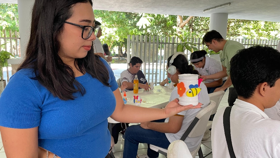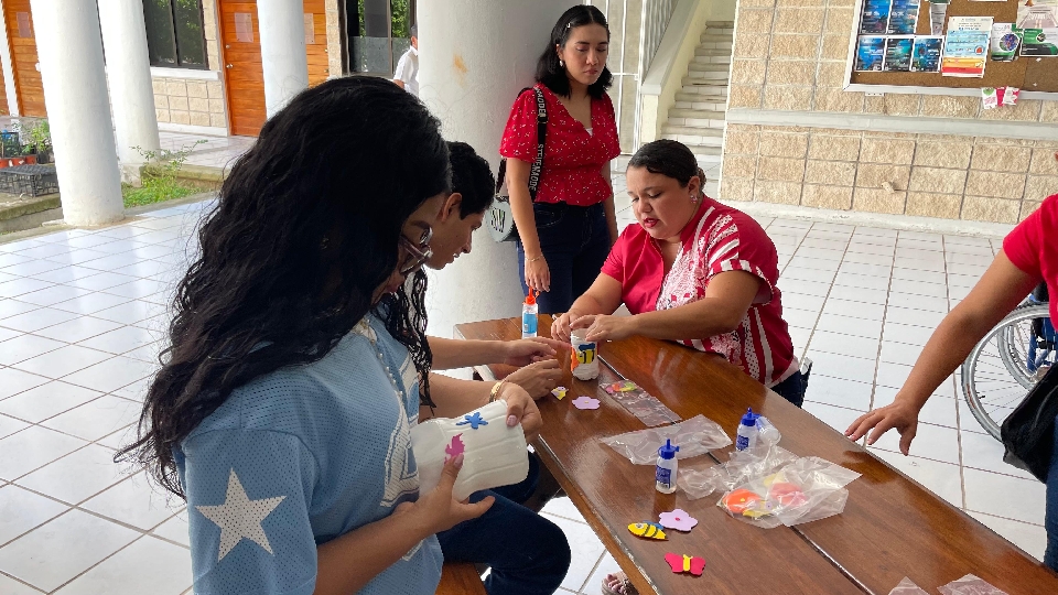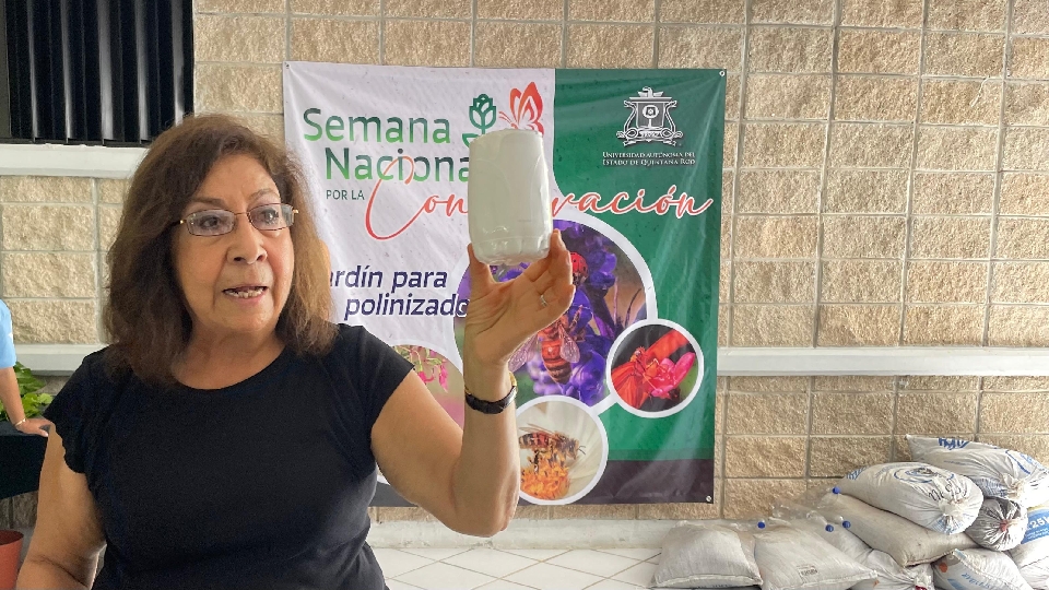La Dra. Magdalena Vázquez González les explicó que en este año se destacará la importancia de los polinizadores y su rol en la producción de frutos y semillas, para lo cual se elaboraron macetas con botellas recicladas en las que los niños plantaron flores.