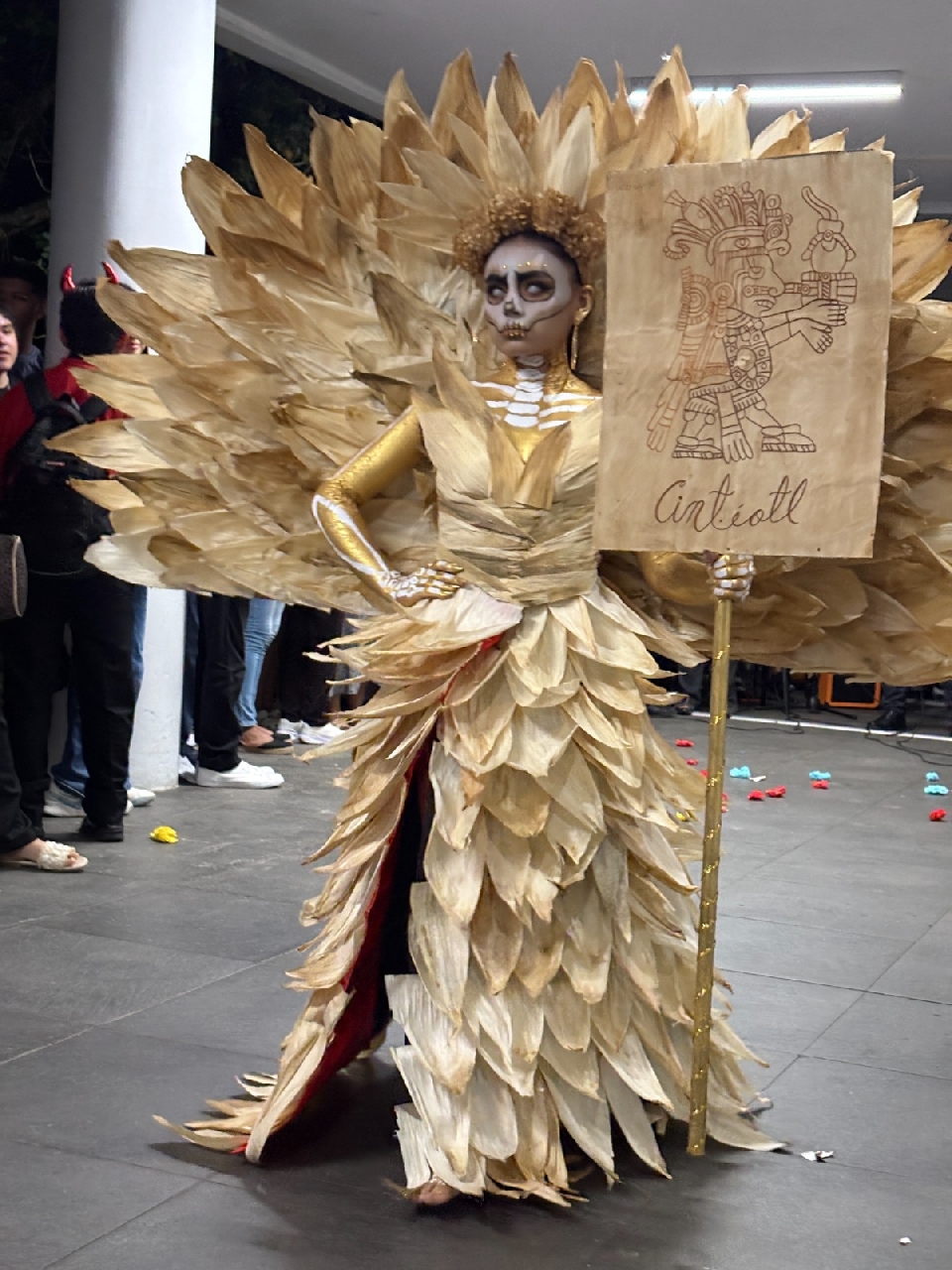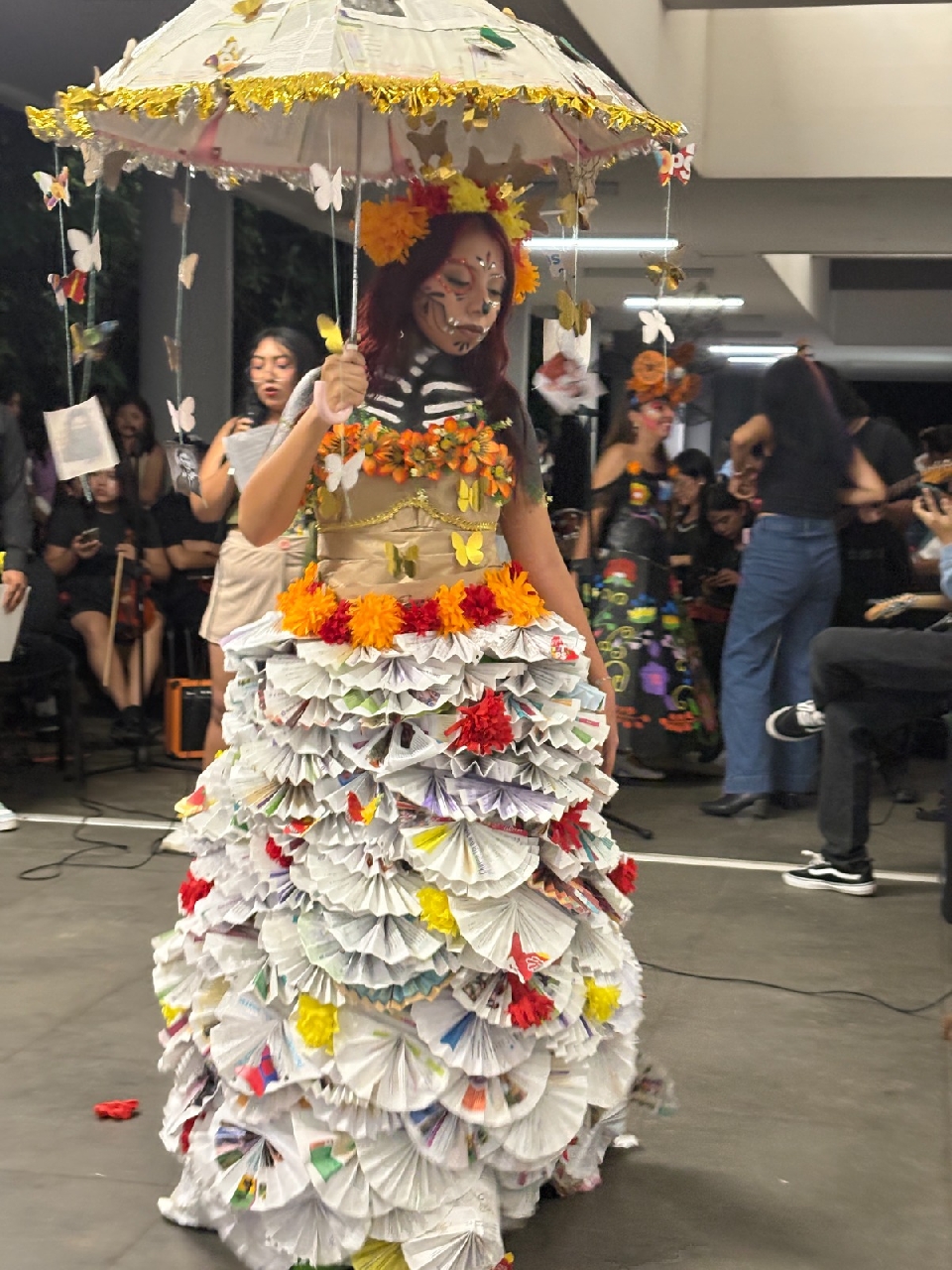 En la Pasarela de Ecocatrinas, estudiantes de actividades culturales y deportivas presentaron vestuarios elaborados con materiales reciclados, acompañados de una breve explicación del proceso creativo, resaltando el compromiso universitario con la sustentabilidad y la expresión artística.
