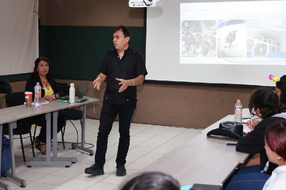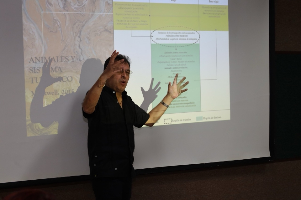 Con un interesante tema “Turismos emergentes: éticas más que humanas en la incorporación de los animales y el medio ambiente”, proporcionado por el investigador del Instituto de Geografía de la UNAM, Dr. Álvaro López López, la mañana de este viernes se llevó a cabo una más de las “Charlas con expertos”; presentaciones organizadas por los integrantes de la Academia de Turismo de la División de Ciencias Multidisciplinarias Cozumel. En esta ocasión, el salón de usos Múltiples de la Unidad de Seminarios del Campus Cozumel fue la sede de la charla, en donde el investigador de la UNAM –ante un público conformado por estudiantado de licenciatura y posgrado— escuchó e interactuó con el ponente, quien destacó que al menos unas 110 millones de personas en el mundo se involucran anualmente en actividades turísticas que afectan a medio millón de animales, por lo que es necesario cambiar la posición de análisis de un humanismo, que ve al ser humano como superior a otras especies, a un posthumanismo filosófico, donde el hombre es una criatura más del orbe.