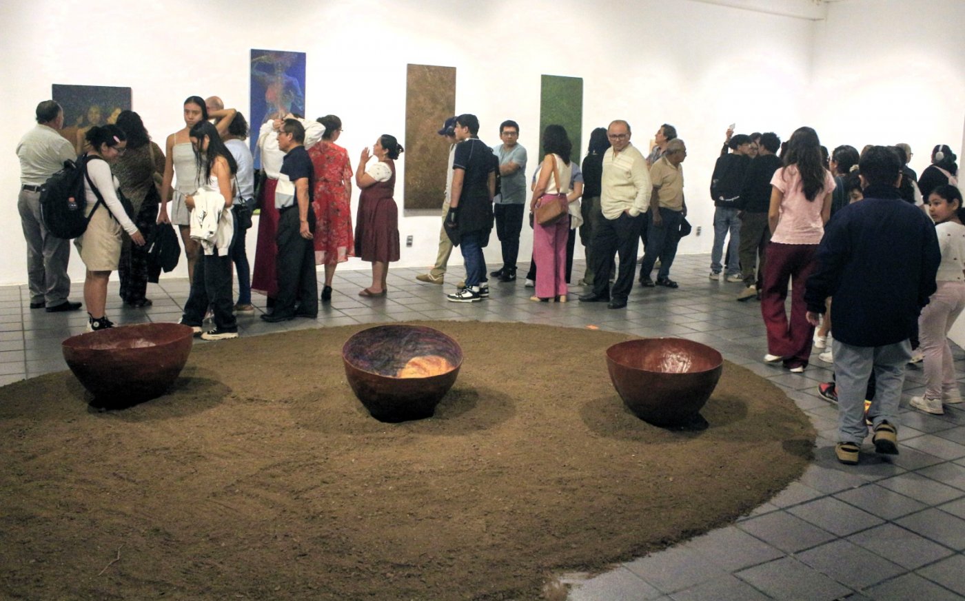 Como parte de la exhibición la artista colocó una elipse de tierra con tres grandes cuencos de papel reciclado, de las cuales dos tienen objetos dentro y en uno, la pintura de una mujer en forma fetal con la que simboliza que se trata de un entierro y en su conjunto tiene que ver cómo morimos y nos transformamos en todo lo demás.
