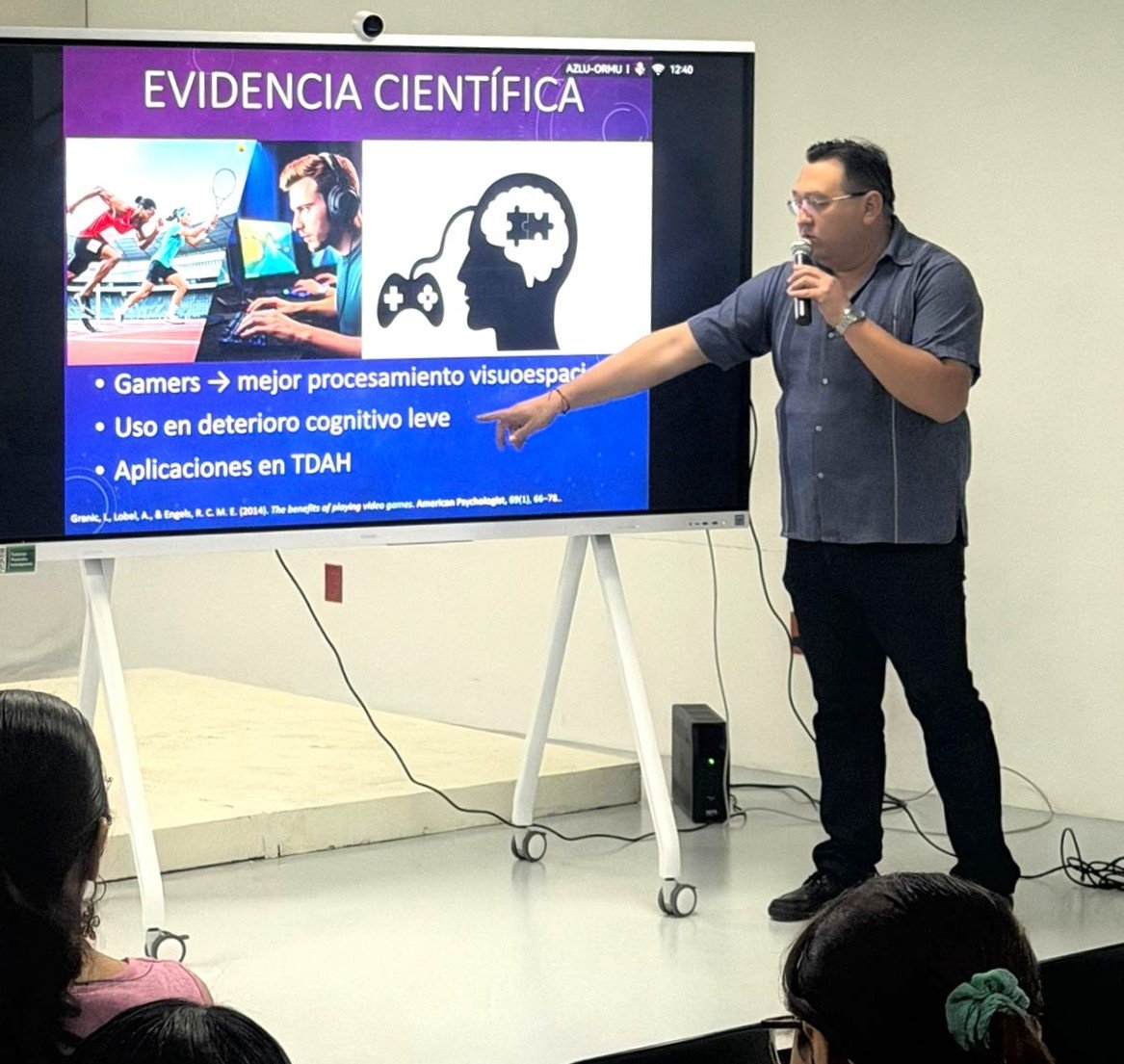 La conferencia se llevó a cabo el 17 de abril en la Sala de Usos Múltiples (Nivel 2, Edificio 2) de la División de Ciencias de la Salud de la UQRoo, en la que se analizó el impacto de los videojuegos en la salud física, mental y cognitiva, así como su potencial como herramientas tecnológicas en áreas como la educación, la rehabilitación y el desarrollo de habilidades en las nuevas generaciones, presentando evidencias científicas sobre su influencia en procesos cognitivos como la atención, la memoria y la toma de decisiones.